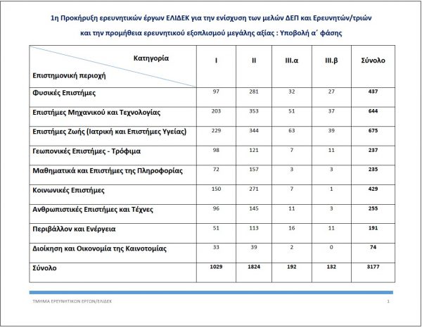 Πέρας διαδικασίας υποβολής προτάσεων (α΄ φάση) για την «1η Προκήρυξη ερευνητικών έργων ΕΛΙΔΕΚ για την ενίσχυση των μελών ΔΕΠ και Ερευνητών/τριών και την προμήθεια ερευνητικού εξοπλισμού μεγάλης αξίας»