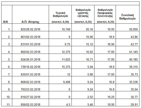 Α. Πίνακας κατάταξης των υποψηφίων για την πλήρωση μίας (1) θέσης υπαλλήλου διοικητικής υποστήριξης στο Ελληνικό Ίδρυμα Έρευνας και Καινοτομίας
