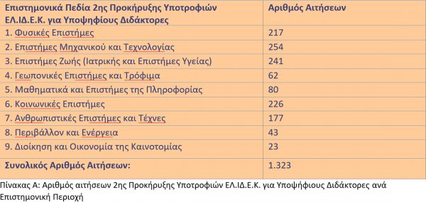 Ο συνολικός αριθμός των αιτήσεων που κατατέθηκαν εντός της προθεσμίας ανέρχεται στις 1.323 και κατανεμήθηκαν κατ’ επιλογή του/της υποβάλλοντος/ουσας την αίτηση στις παρακάτω ευρείες Επιστημονικές Περιοχές Έρευνας ως εξής: