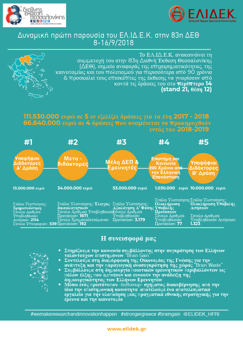 Η δυναμική πρώτη παρουσία του ΕΛ.ΙΔ.Ε.Κ. στην ΔΕΘ σκοπεύει να αναδείξει τον ρόλο, τον στόχο και την αποστολή του ως βασικού πυλώνα στήριξης της έρευνας και της καινοτομίας στη χώρα αλλά και ως καταλύτη στην αναχαίτιση του φαινομένου ”Brain Drain”.