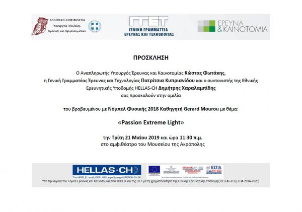 Oμιλία του βραβευμένου με Νόμπελ Φυσικής 2018 Καθηγητή Gerard Mourou με θέμα: «Passion Extreme Light» την Τρίτη 21 Μαΐου 2019, στο αμφιθέατρο του Μουσείου της Ακρόπολης