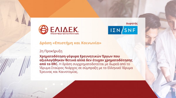 Τη Δευτέρα 23 Σεπτεμβρίου 2019 στις 12:00 (ώρα Ελλάδας) ξεκίνησε η υποβολή ερευνητικών προτάσεων για τη δράση με τίτλο «Χρηματοδότηση – γέφυρα Ερευνητικών Έργων που αξιολογήθηκαν θετικά αλλά δεν έτυχαν χρηματοδότησης από το ERC» με καταληκτική ημερομηνία την 14η Οκτωβρίου 2019, 17:00 (ώρα Ελλάδας) μέσω της Διαδικτυακής Πύλης του ΕΛ.ΙΔ.Ε.Κ. Η δράση συγχρηματοδοτείται με δωρεά από το Ίδρυμα Σταύρος Νιάρχος (ΙΣΝ) σε σύμπραξη με το Ελληνικό Ίδρυμα Έρευνας και Καινοτομίας.