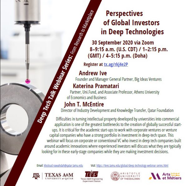 Στο πλαίσιο υλοποίησης του Μνημονίου συνεργασίας μεταξύ του ΕΛ.ΙΔ.Ε.Κ. και του TEES του Πανεπιστημίου Texas A&M, σας προσκαλούμε να παρακολουθήσετε το 2o στη σειρά webinar με τίτλο «Perspectives of Global Investors in Deep Technologies».
