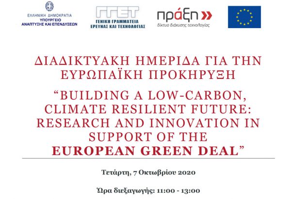 Σας ενημερώνουμε ότι τo Δίκτυο ΠΡΑΞΗ με την υποστήριξη της Γενικής Γραμματείας Έρευνας και Τεχνολογίας διοργανώνει την Τετάρτη 7 Οκτωβρίου 2020, διαδικτυακή ημερίδα για την παρουσίαση της ευρωπαϊκής προκήρυξης “Building a low-carbon, climate resilient future: Research and innovation in support of the European Green Deal” (link) .