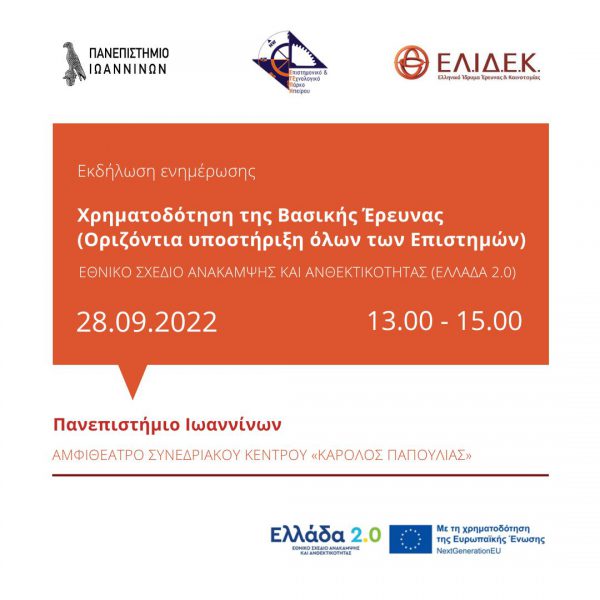Το Πανεπιστήμιο Ιωαννίνων, το Επιστημονικό και Τεχνολογικό Πάρκο Ηπείρου (Ε.ΤΕ.Π.Η.) και το ΕΛ.ΙΔ.Ε.Κ. διοργανώνουν την Τετάρτη, 28 Σεπτεμβρίου 2022 (13.00 – 15.00) ημερίδα ενημέρωσης για τη Δράση «Χρηματοδότηση της Βασικής Έρευνας» (Οριζόντια υποστήριξη όλων των Επιστημών).