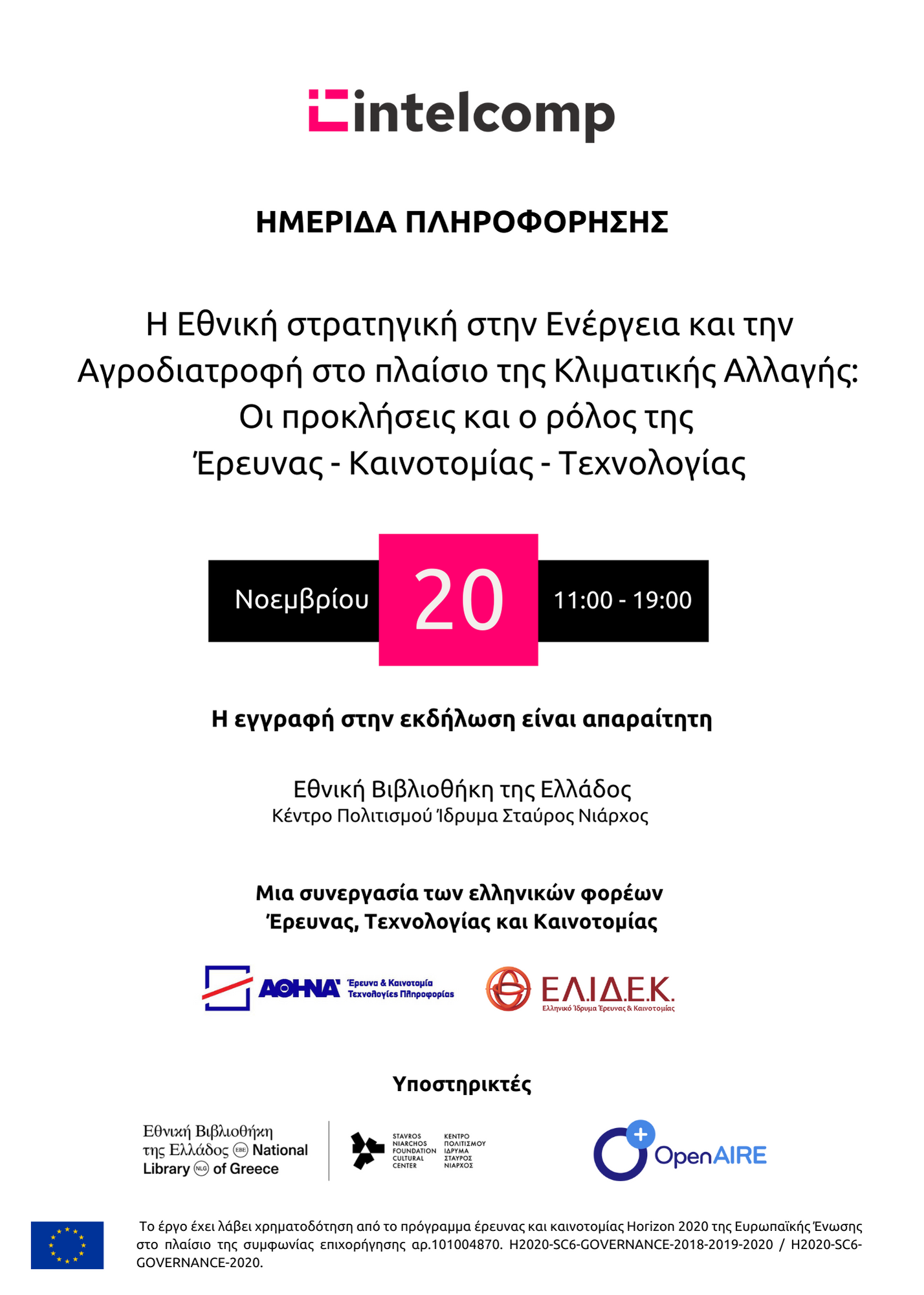 Τη Δευτέρα 20 Νοεμβρίου 2023 (11:00-19:00) το Ερευνητικό Κέντρο Αθηνά και το Ελληνικό Ίδρυμα Έρευνας και Καινοτομίας (ΕΛ.ΙΔ.Ε.Κ.), σε συνεργασία με την Εθνική Βιβλιοθήκη της Ελλάδος, Κέντρο Πολιτισμού Ίδρυμα Σταύρος Νιάρχος, διοργανώνουν ημερίδα ενημέρωσης με τίτλο «Η εθνική στρατηγική στην ενέργεια και την αγροδιατροφή στο πλαίσιο της κλιματικής αλλαγής: Οι προκλήσεις και ο ρόλος της Έρευνας-Καινοτομίας-Τεχνολογίας».