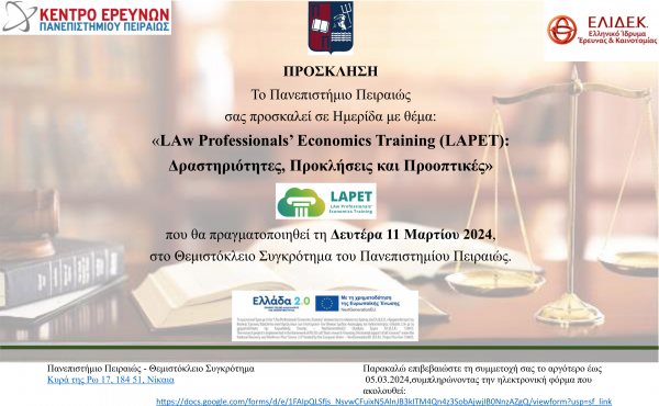 Στο πλαίσιο υλοποίησης του ερευνητικού έργου “Law Professional’s Economics Training (LAPET)”, το Πανεπιστήμιο Πειραιώς διοργανώνει Ημερίδα με θέμα Law Professional’s Economics Training (LAPET): Δραστηριότητες, Προκλήσεις και Προοπτικές την Δευτέρα 11 Μαρτίου 2024 και ώρα 10:00 – 15:45 στο Θεμιστόκλειο Συγκρότημα του Πανεπιστημίου, στη Νίκαια.