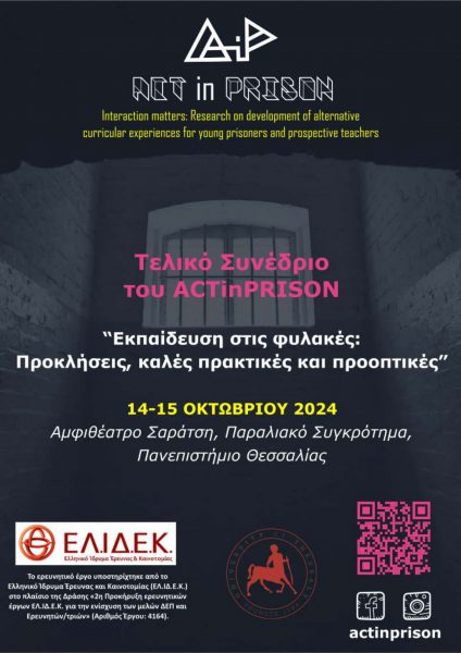 Στο πλαίσιο του ερευνητικού έργου ACTinPRISON διοργανώνεται τελικό συνέδριο με τίτλο «Εκπαίδευση στις φυλακές: Προκλήσεις, καλές πρακτικές και προοπτικές». Το συνέδριο θα πραγματοποιηθεί στις 14-15 Οκτωβρίου 2024, στο Αμφιθέατρο Σαράτση, στο Παραλιακό Συγκρότημα του Πανεπιστημίου Θεσσαλίας.