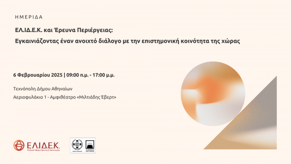 Η ημερίδα θα μεταδίδεται ζωντανά από το κανάλι του ΕΛ.ΙΔ.Ε.Κ. στο YouTube (https://www.youtube.com/@elidek-hfri).