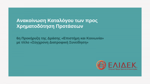 Το Ελληνικό Ίδρυμα Έρευνας και Καινοτομίας (ΕΛ.ΙΔ.Ε.Κ.) ανακοινώνει, κατόπιν ολοκλήρωσης της διαδικασίας αξιολόγησης, τις δέκα (10) ερευνητικές προτάσεις που θα χρηματοδοτηθούν στο πλαίσιο της 6ης Προκήρυξης της Δράσης «Επιστήμη και Κοινωνία» με τίτλο «Σύγχρονη Διατροφική Συνείδηση». Ο συνολικός εγκεκριμένος προϋπολογισμός ανέρχεται στις 999.769,00 ευρώ (€) και κατανέμεται σε Έργα που στοχεύουν στη διάδοση της επιστημονικής γνώσης και στην κοινωνική ευαισθητοποίηση σε θέματα που άπτονται της διατροφής.