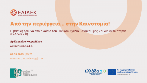 Στο πλαίσιο της συμμετοχής στην 89η Διεθνή Έκθεση Θεσσαλονίκης, το Ελληνικό Ίδρυμα Έρευνας και Καινοτομίας θα πραγματοποιήσει την Κυριακή 7 Σεπτεμβρίου 2025 στις 13:20, στο Περίπτερο 7 – Υπουργείο Ανάπτυξης, την ειδική εκδήλωση με τίτλο: «ΕΛ.ΙΔ.Ε.Κ.: Από την περιέργεια… στην Καινοτομία! Η βασική έρευνα στο πλαίσιο του Εθνικού Σχεδίου Ανάκαμψης και Ανθεκτικότητας (Ελλάδα 2.0)».