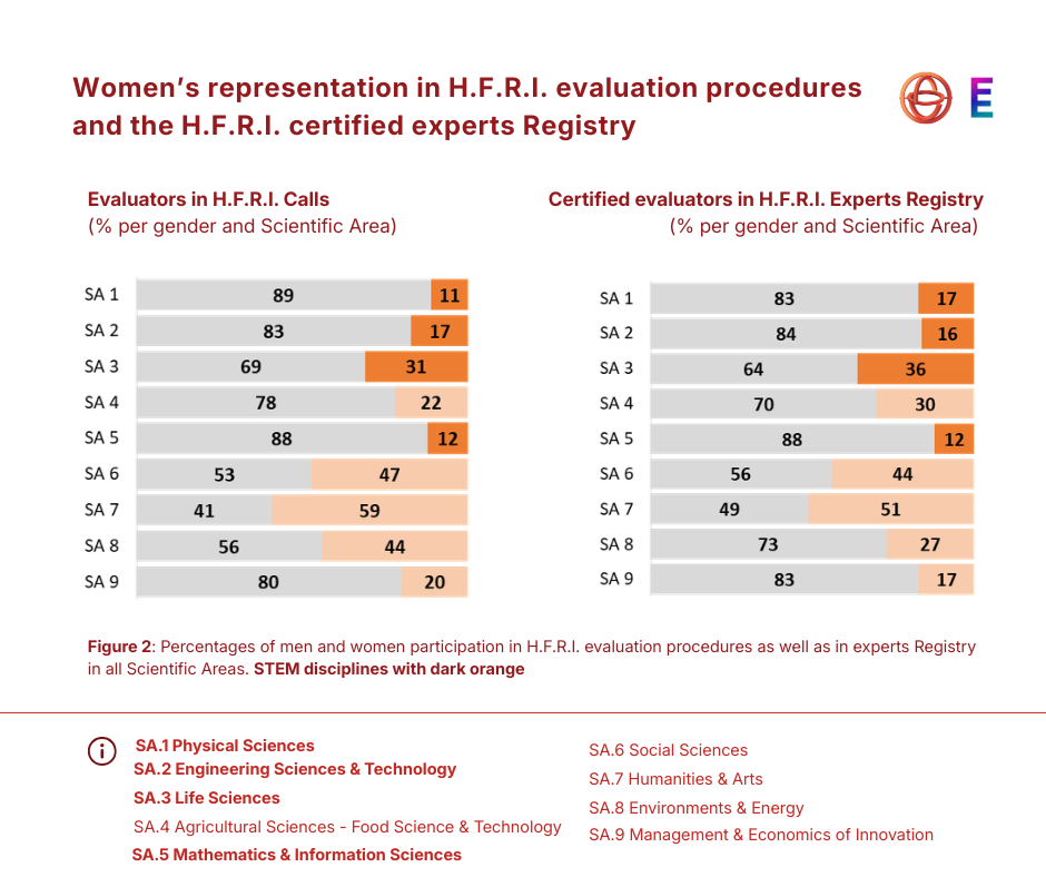 Evaluation plays a critical role in shaping research systems. Who evaluates research influences funding decisions, career progression and how excellence is defined. H.F.R.I.’s data reveal that women remain under-represented in evaluation panels and in the H.F.R.I.’s Registry, particularly in STEM disciplines (Fig. 2). This further underlines the need for targeted and sustained measures, aligned with the objectives of Horizon Europe and the development of Gender Equality Plans (GEPs).