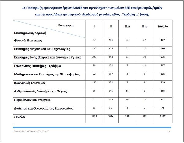 Ο συνολικός αριθμός των υποβληθεισών προτάσεων προσεγγίζει τις 3200. Τα στατιστικά ανά επιστημονική περιοχή και κατηγορία έργων παρατίθενται στον πίνακα που ακολουθεί.