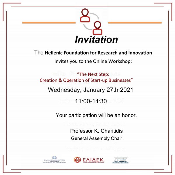 The Hellenic Foundation for Research and Innovation invites you to the Online Workshop: The Next Step: Creation & Operation of Start-up Businesses on Wednesday January 27th 2021 at 11:00