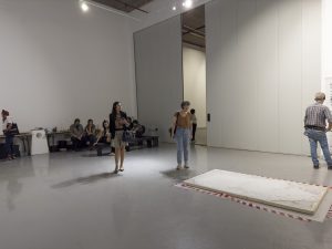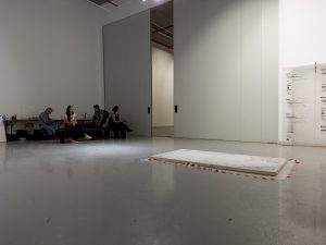 The guests had the opportunity to tour the artist’s exhibition, which presents “minimalist in situ interventions, sculptural and audiovisual installations and projections, in a subtly dialogical interplay between them, creating a low-voiced contemplative universe” as well as the “lecture-performance ‘Motivation,’” which constitutes a pending and ongoing creation, which is constantly measured in each of the artist’s encounters with the public.”