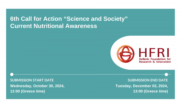 The Hellenic Foundation for Research and Innovation (H.F.R.I.), today, Thursday, October 3rd, 2024, issued the 6th Call for Action “Science and Society” entitled “Contemporary Nutritional Consciousness”, furthering its mission to support research activity in Greece, without thematic or geographical limitations.