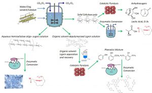 The NoWasteBioTech aims at developing a zero-waste biorefinery concept by using novel pretreatment/fractionation technologies and combining them with thermochemical and enzymatic/fermentation technologies. Agricultural residues such as corn stover and cotton stalks will be fractionated to their three basic constituents, producing three distinct streams: (1) A solid cellulose pulp, (2) An aqueous stream of hemicellulose oligo- and mono- sugars, (3) A depolymerized lignin. Enzymatic and biotransformation processes will be employed to produce high added value chemicals and food additives such as Prebiotics, Lactic acid and Polyunsaturated fatty acids (PUFAs).