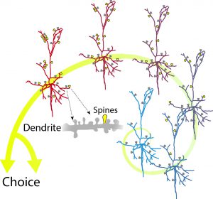 Action selection should be both stable to maximize positive outcomes and flexible to adapt in a changing environment. The dorsal prefrontal cortex (dPFC) exerts control on action selection and mediates adaptive decision making. Neuronal populations in the dPFC respond with abrupt changes in their state, following accumulative evidence for an environmental change, yet the mechanisms underlying this sudden change in neuronal dynamics remain unexplored. It is hypothesized that newly emerged spines (the locus of excitatory transmission) underlie adaptation of neural systems, while stable spines constitute part of the memory storage machinery.